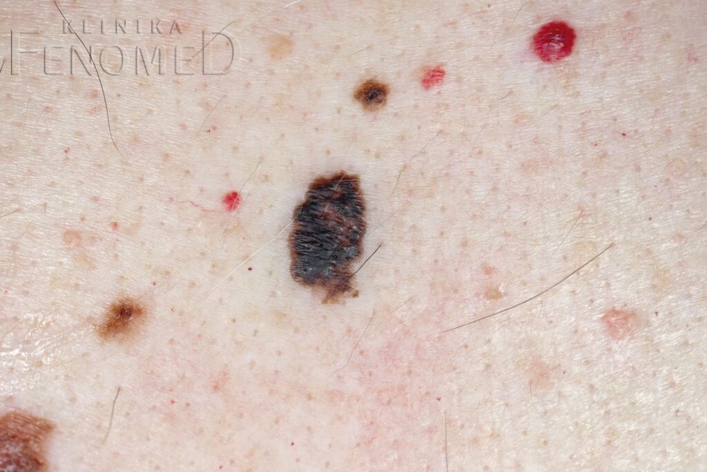 Duża brodawka łojotokowa na skórze pleców- zdjęcie makro