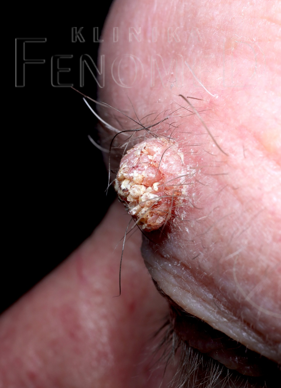 Obraz makroskopowy brodawki łojotokowej na owłosionej skórze głowy
