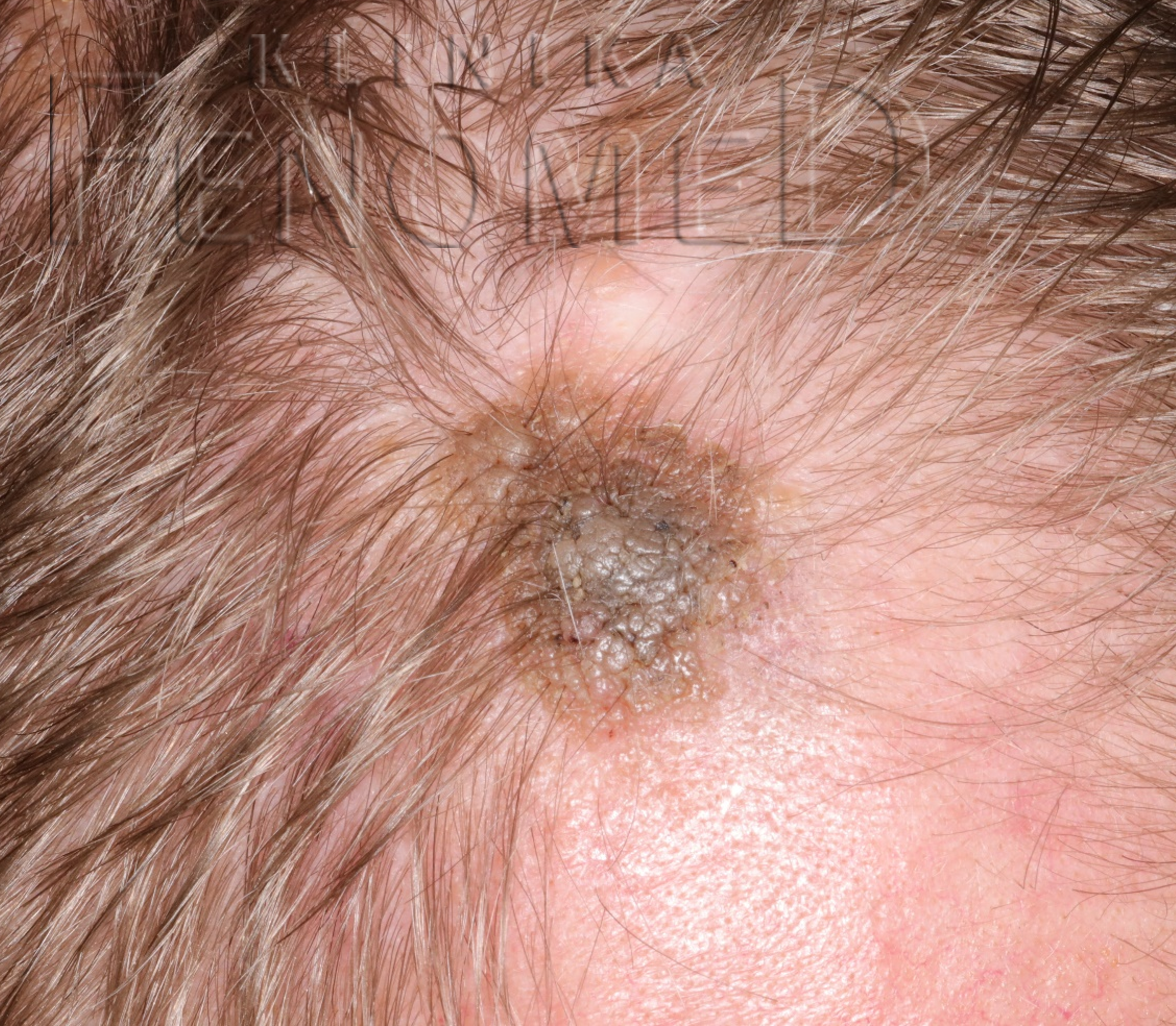 Duże brodawki łojotokowe na skórze głowy. Zdjęcie przed i 13 lat po usunięciu.