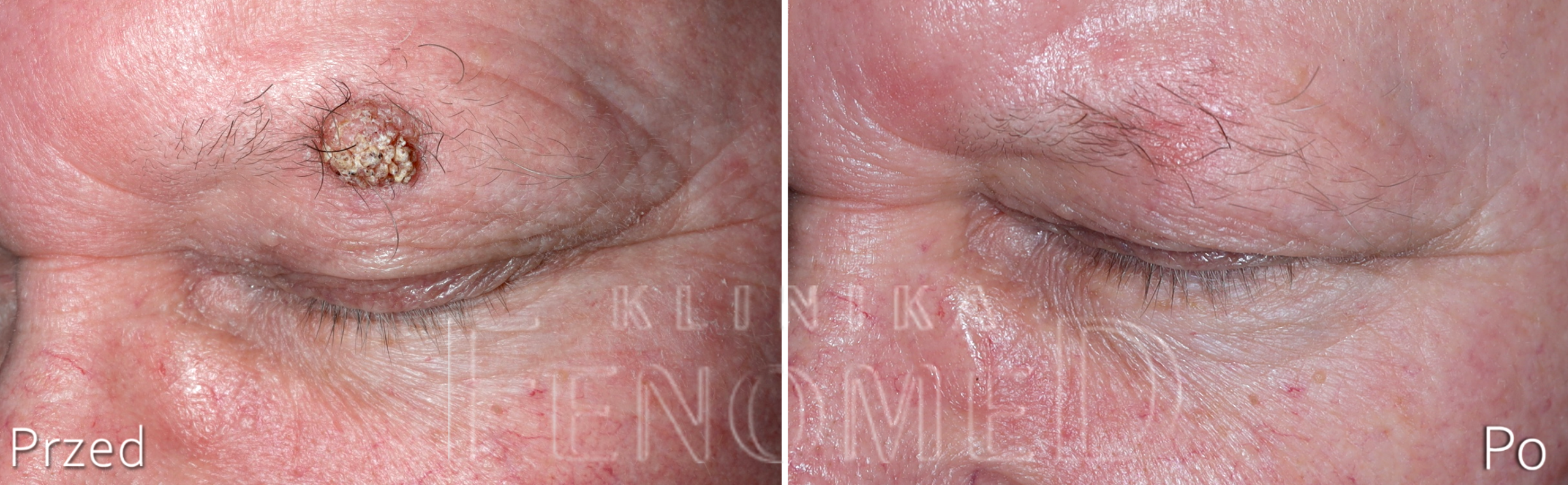 Brodawka łojotokowa na skórze brwi. Efekt przed i 1 miesiąc po zabiegu.