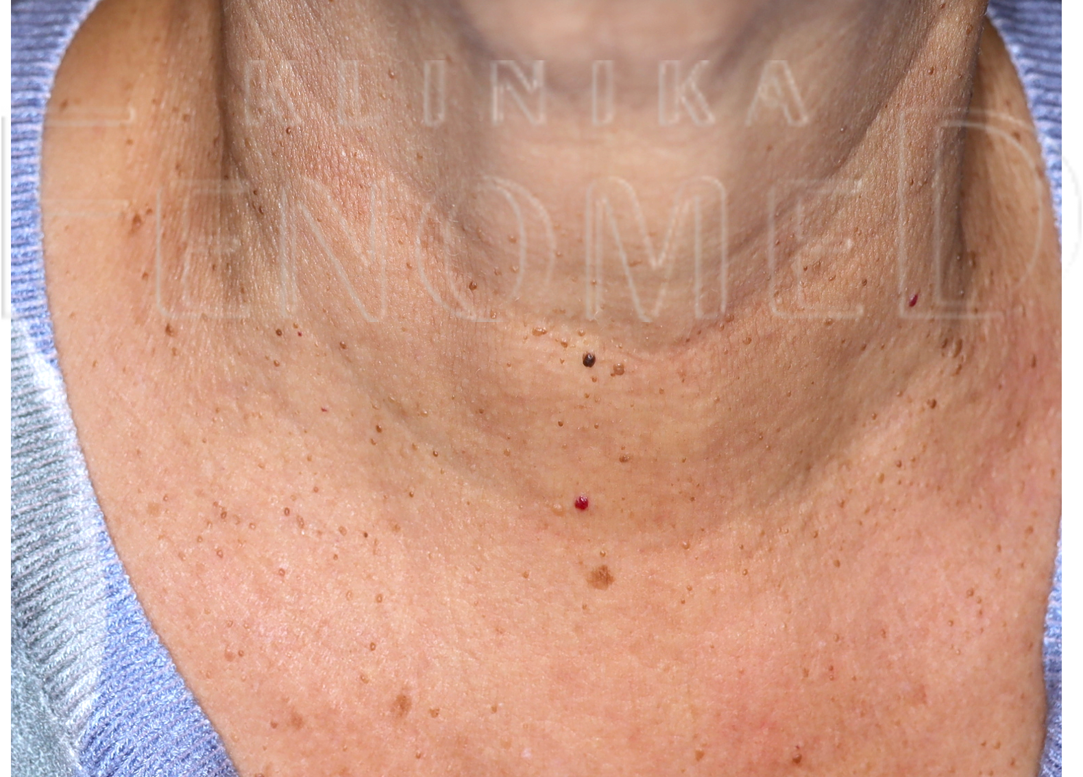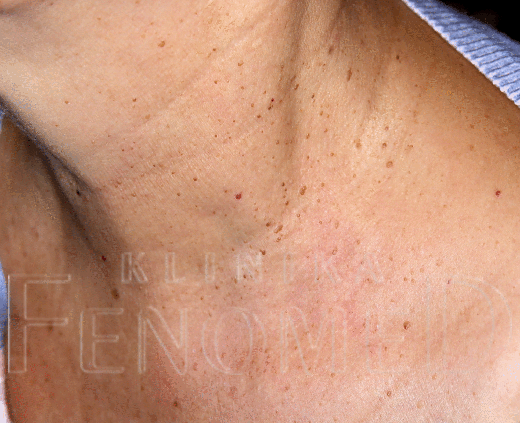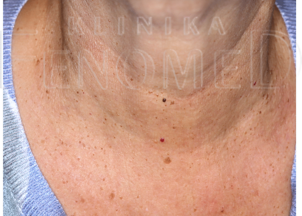 Skupiska brodawek łojotokowych na skórze klatki piersiowej. Zdjęcie przed i 4 lata po usunięciu.
