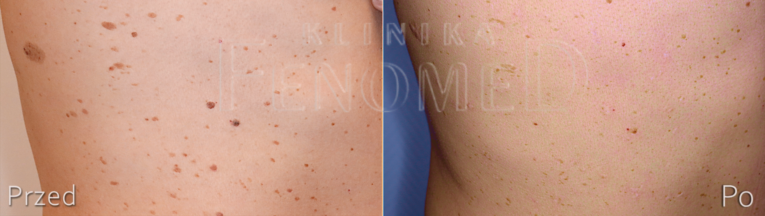 Brodawki łojotokowe na skórze brzucha. Efekt przed i 4 miesiące po zabiegu.