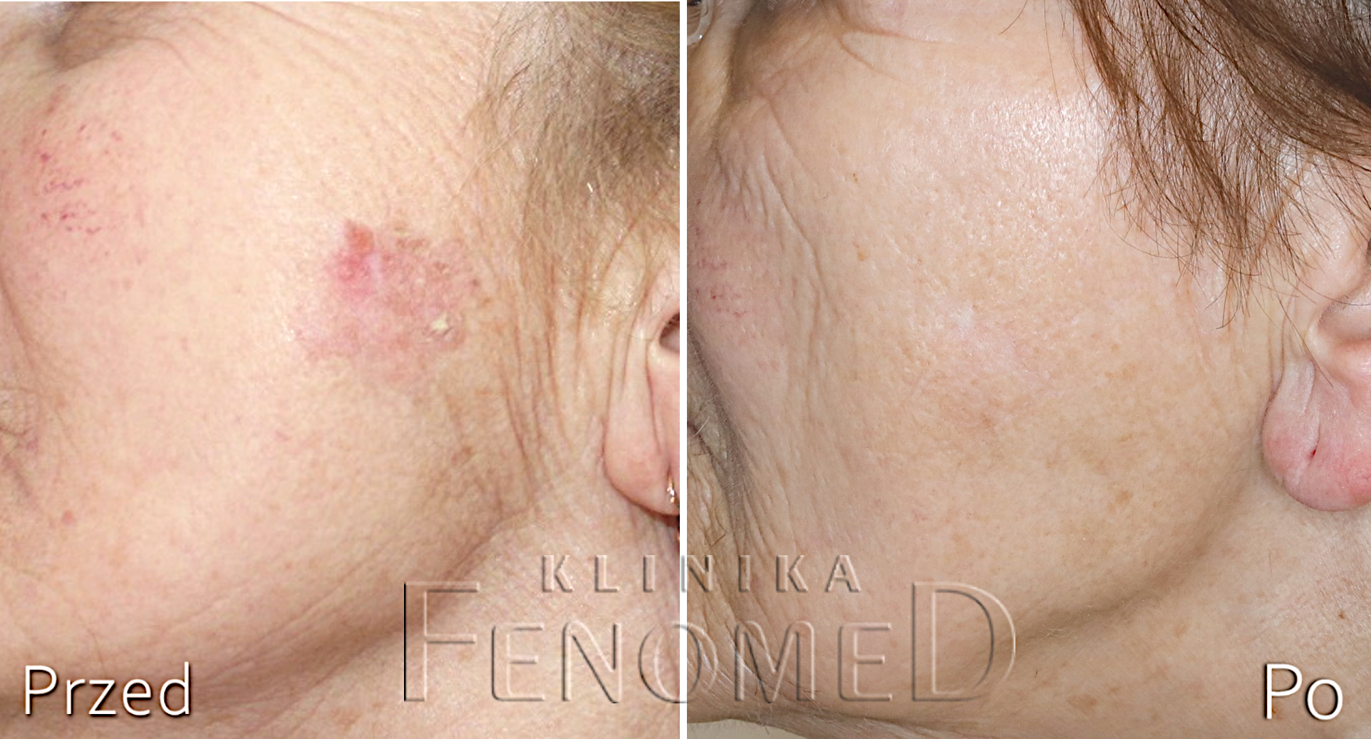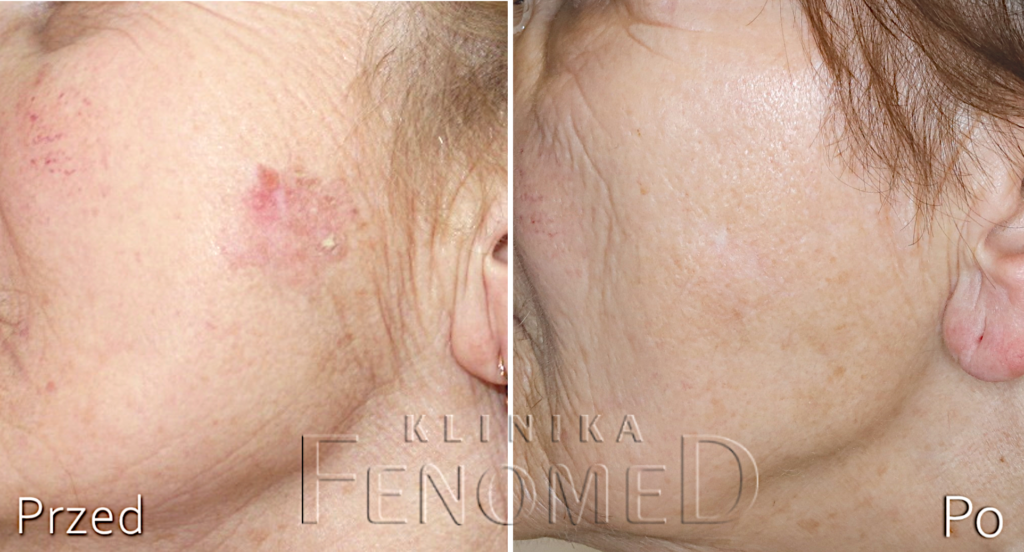Choroba Bowena na skórze policzka. Stan przed i 3 miesiące po terapii fotodynamicznej