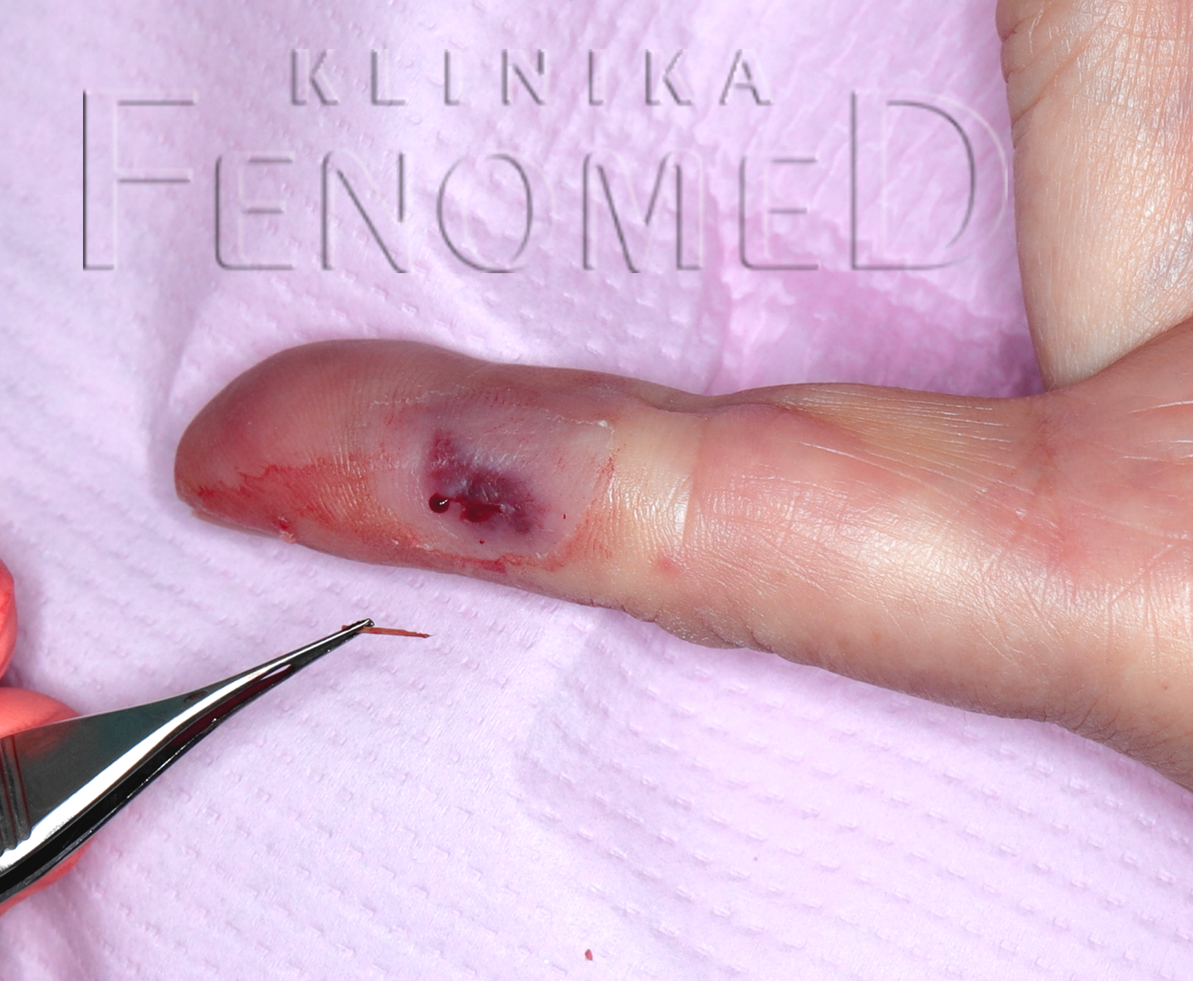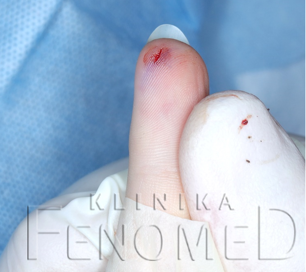 Bezpośrednio po wyjęciu ciała obcego z palca. Ciało obce widoczne na rękawiczce.