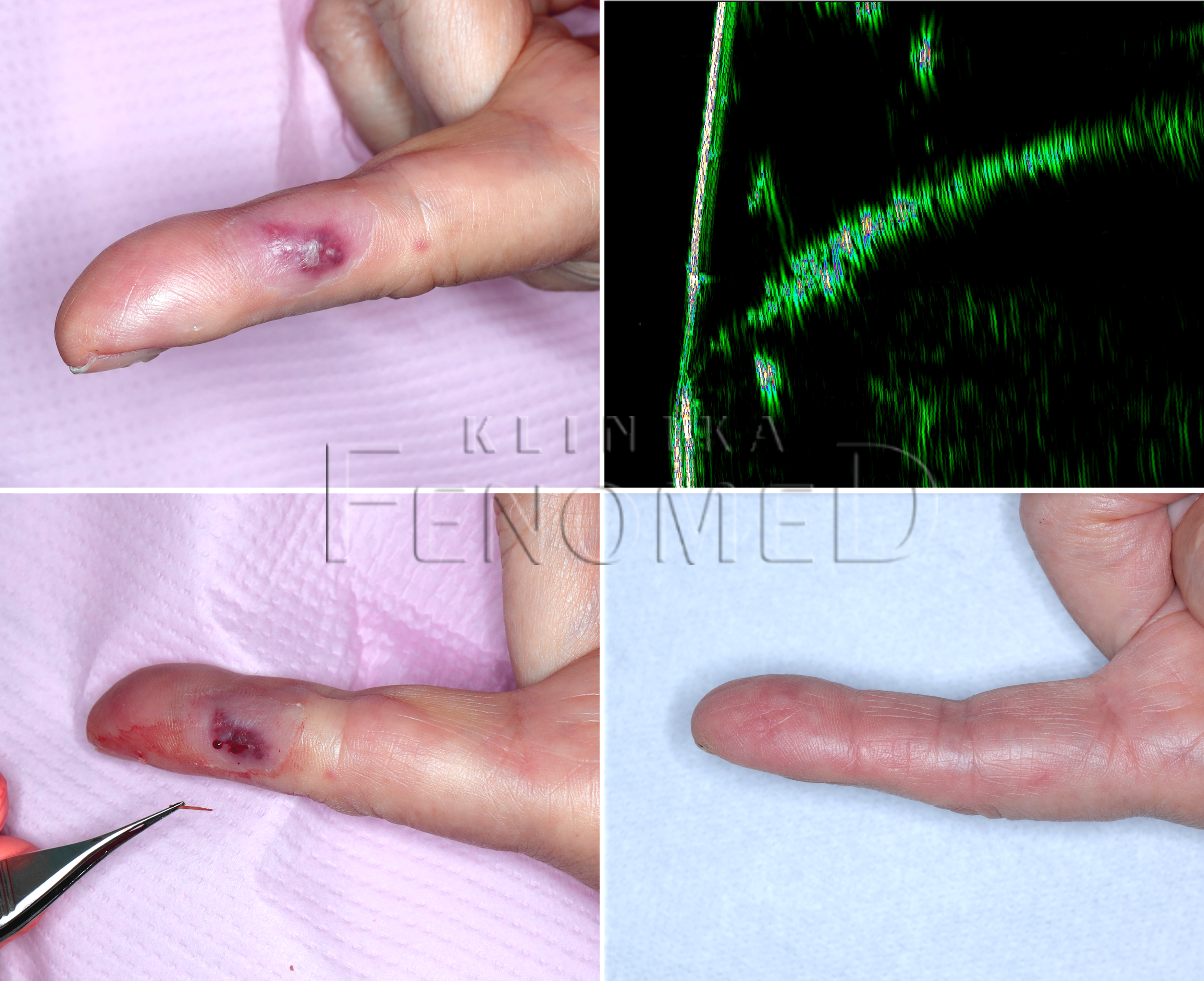 Pierwsze zdjęcie (Przed): Pacjent zgłosił się z bolesną zmianą palca od kilku tygodni. Dotychczas był nieskutecznie leczony antybiotykiem. Zmiana miała charakter zapalny. Drugie zdjęcie: Obraz ultrasonograficzny (USG) skóry palca. Wyraźnie widoczne ciało obce w skórze właściwej (strzałka). Zdjęcie ilustruje dokładne położenie ciała obcego, co umożliwia dokładne jego usunięciu. Trzecie zdjęcie (Po wyjęciu ciała obcego): Zdjęcie pokazuje moment po wyjęciu drzazgi. Na zdjęciu można zobaczyć także samą drzazgę, która została wyjęta. Czwarte zdjęcie (Stan po zabiegu): Palec miesiąc po zabiegu, całkowicie wygojony. Skóra jest gładka, bez widocznych śladów po wcześniejszej zmianie zapalnej.