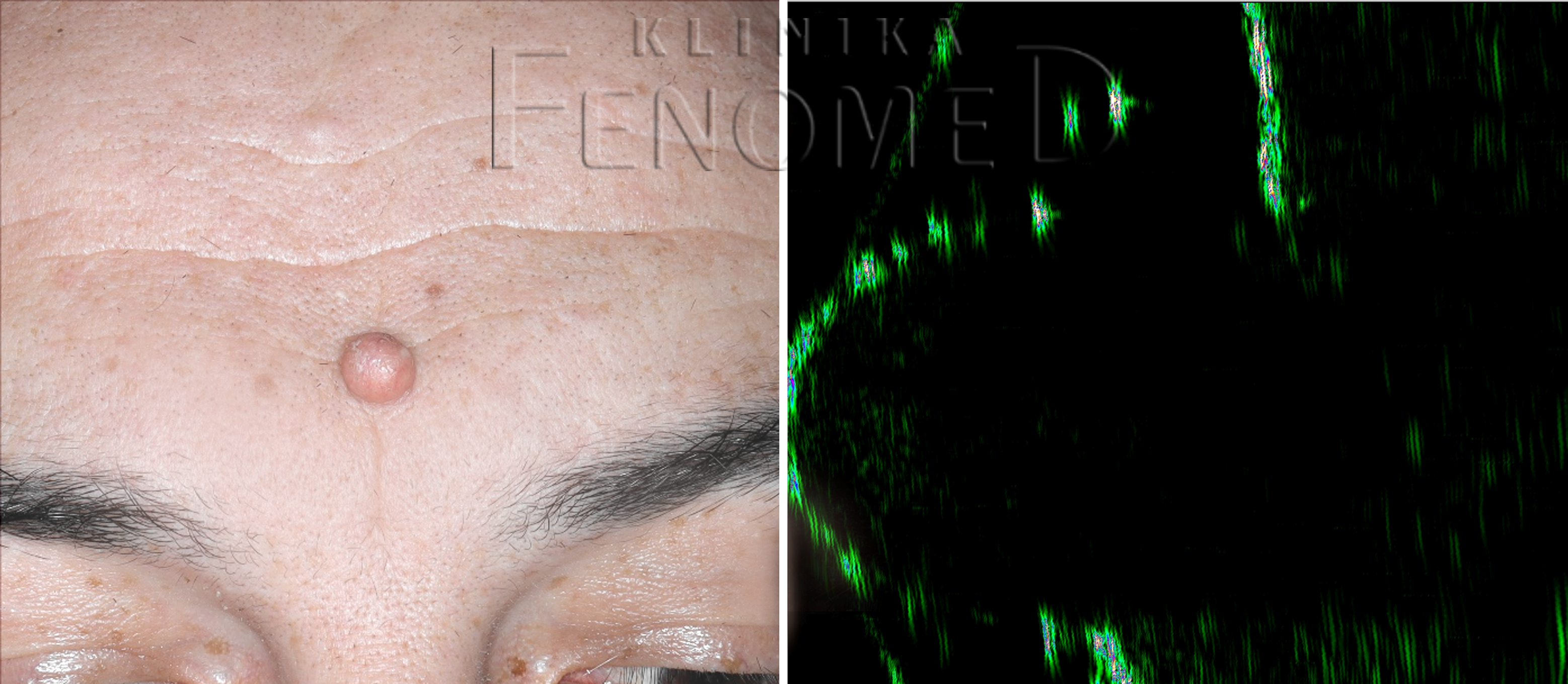 Juvenile xanthogranuloma na skórze czoła oraz zdjęcie USG.