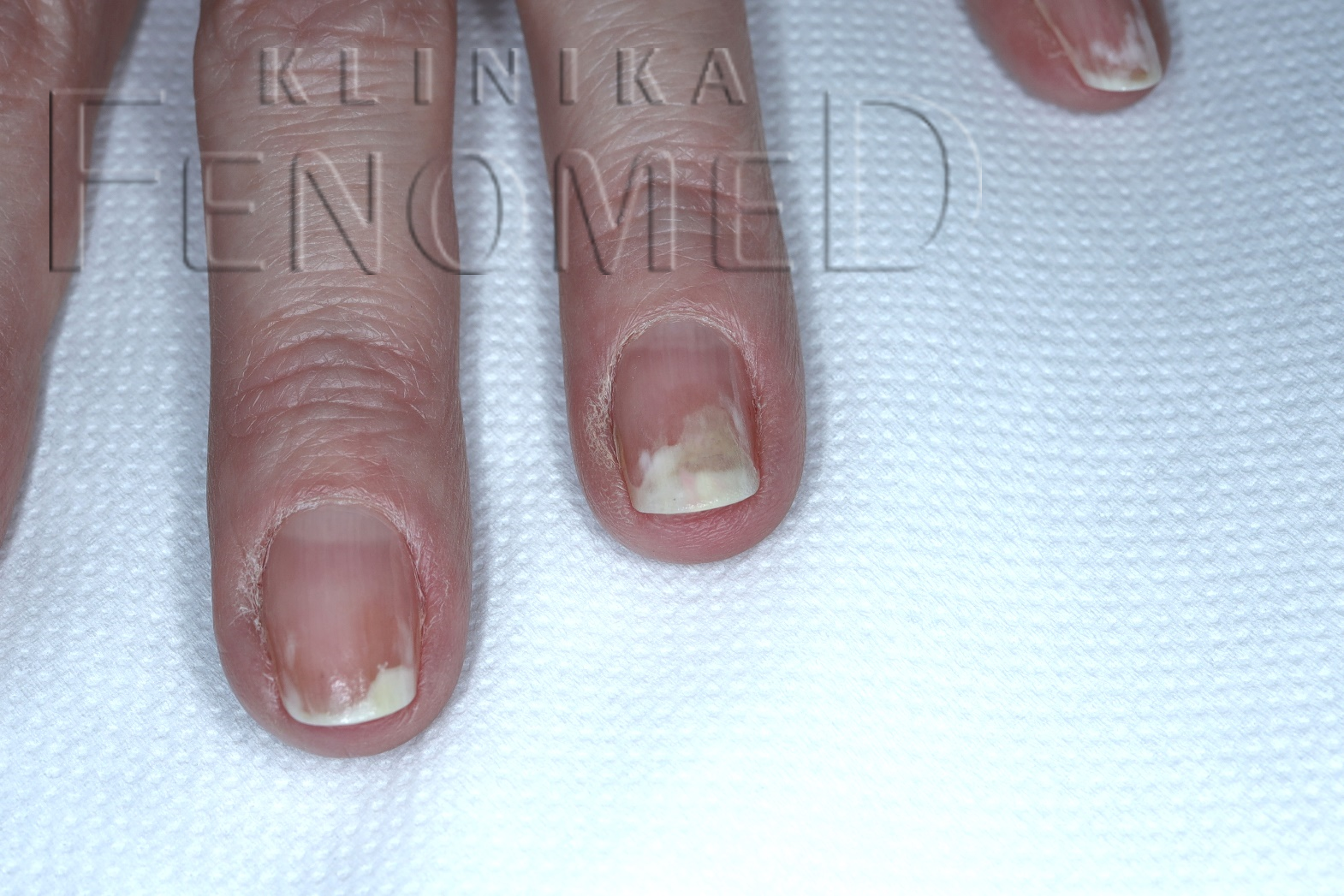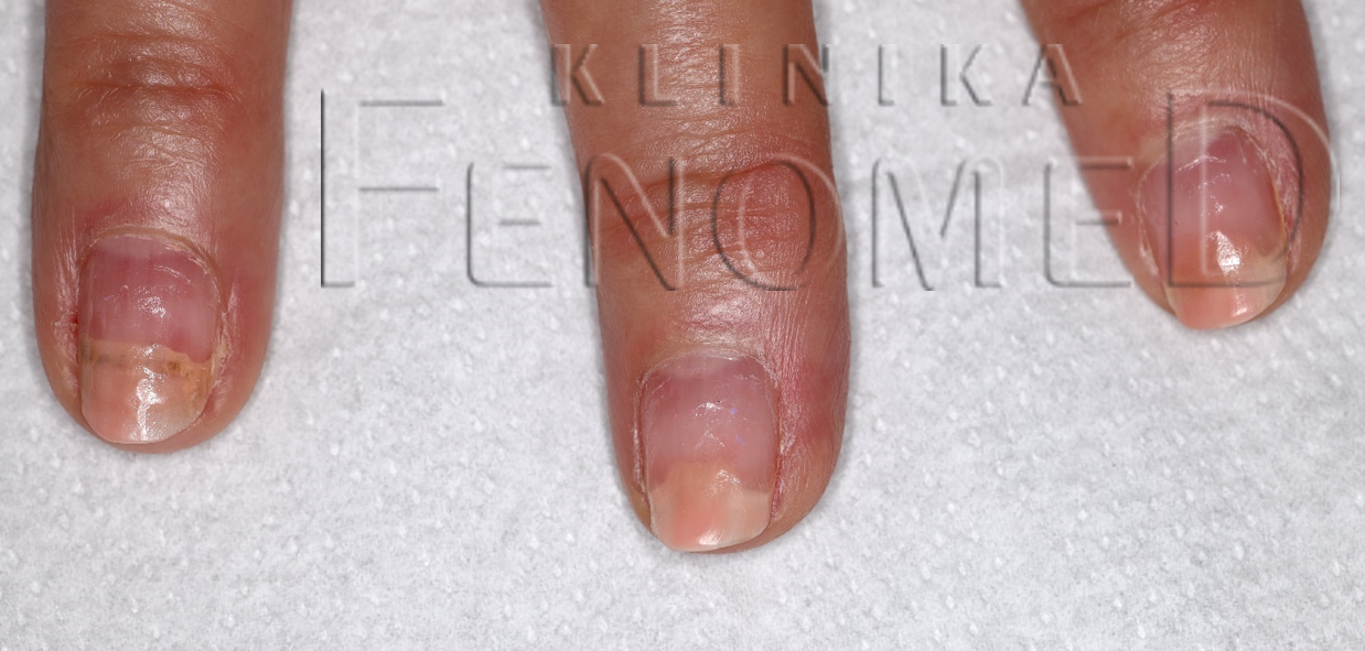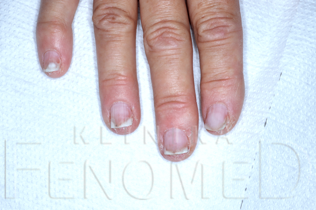 Onycholiza paznokci oraz hiperkeratoza podpaznokciowa spowodowana stosowaniem lakieru hybrydowego.