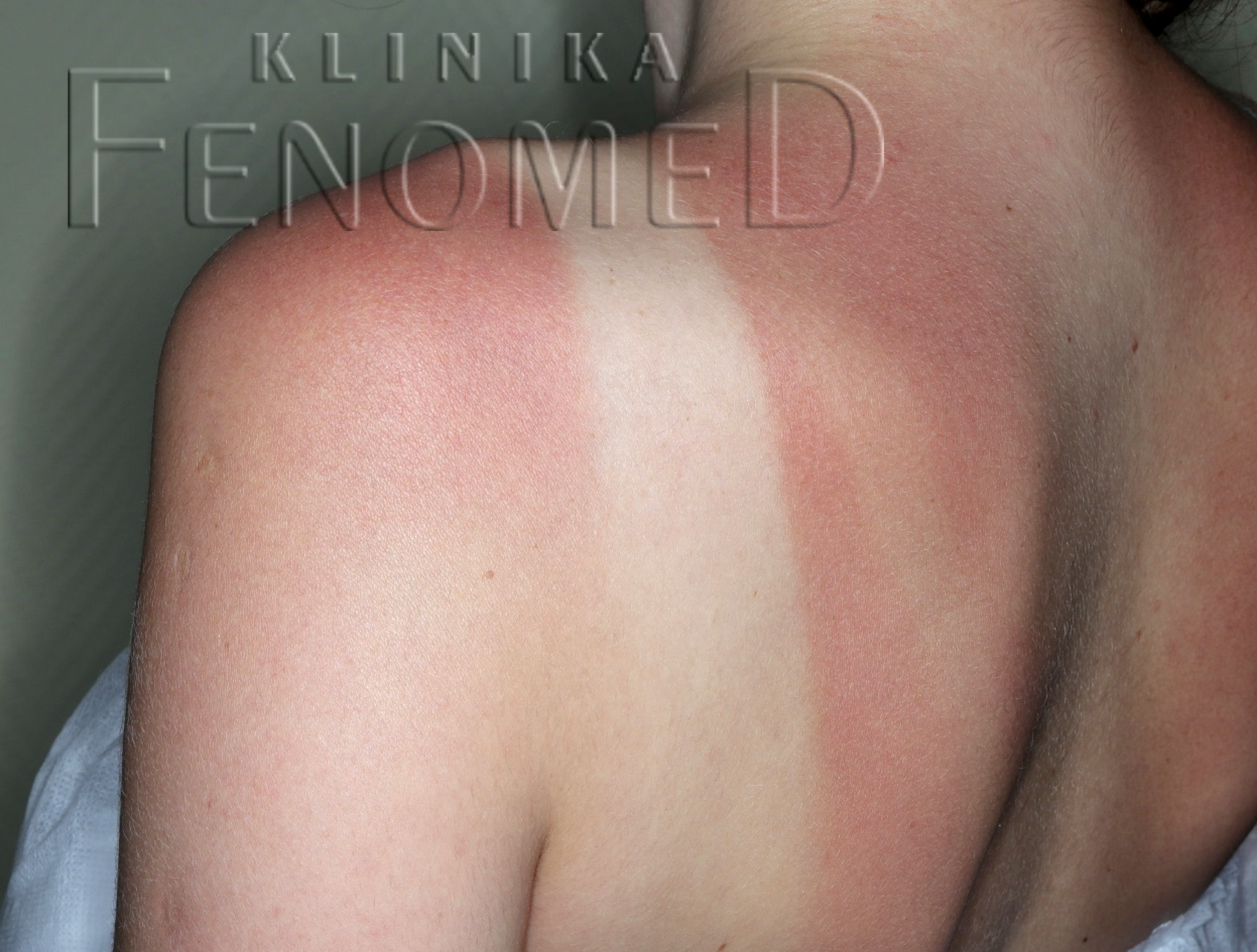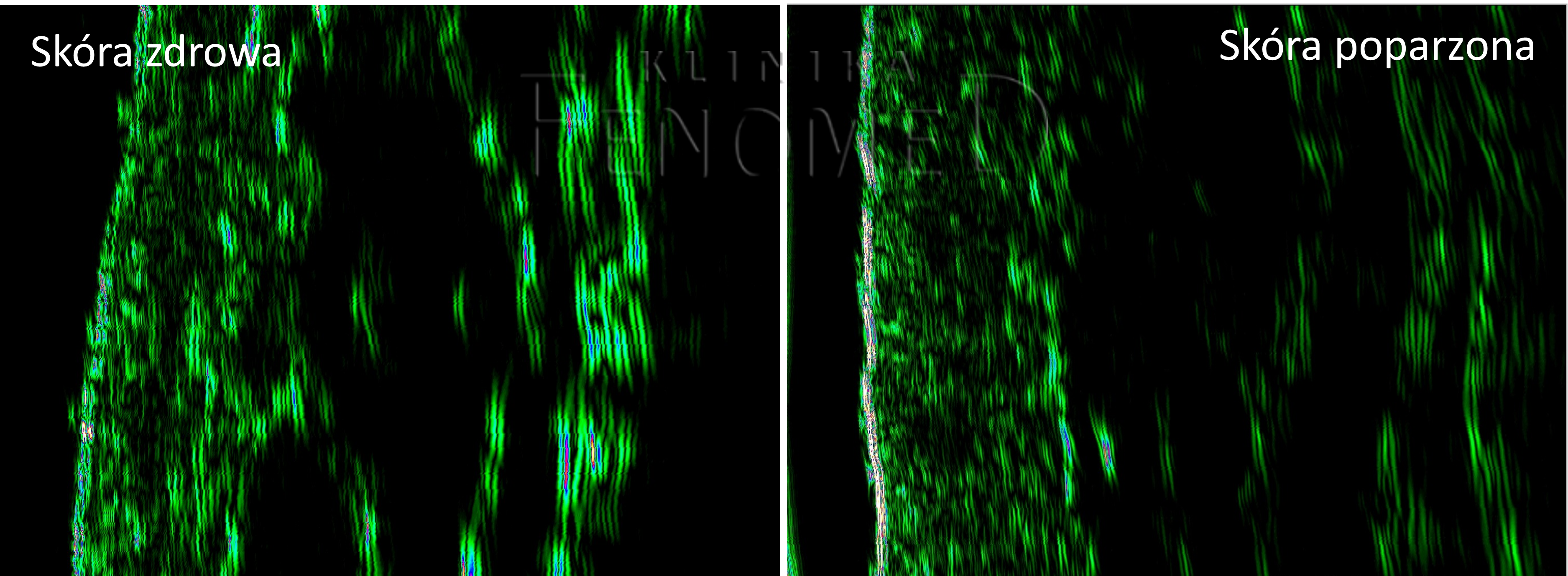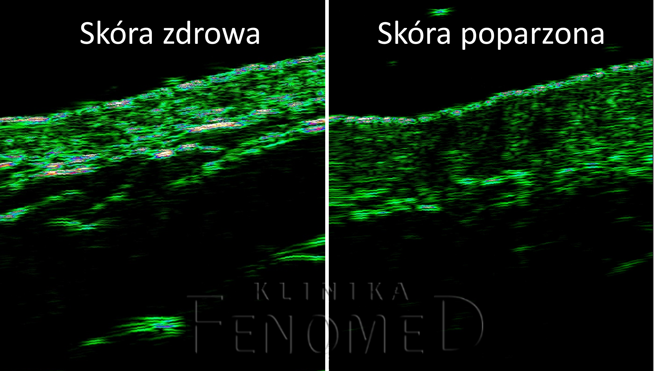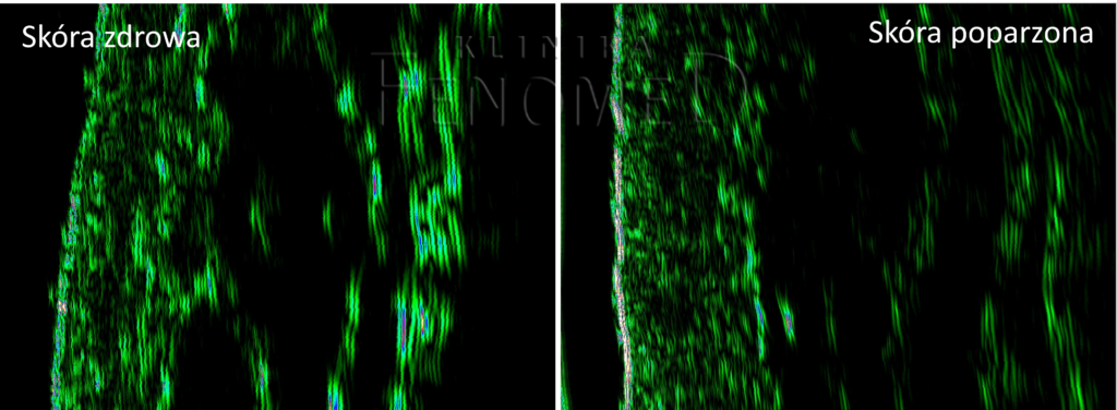 Na zdjęciu widzimy obrzęk w warstwie skóry właściwej, który na obrazie USG widoczny jest jako hipoechogeniczny obszar (ciemniejszy) w porównaniu do zdrowej skóry.