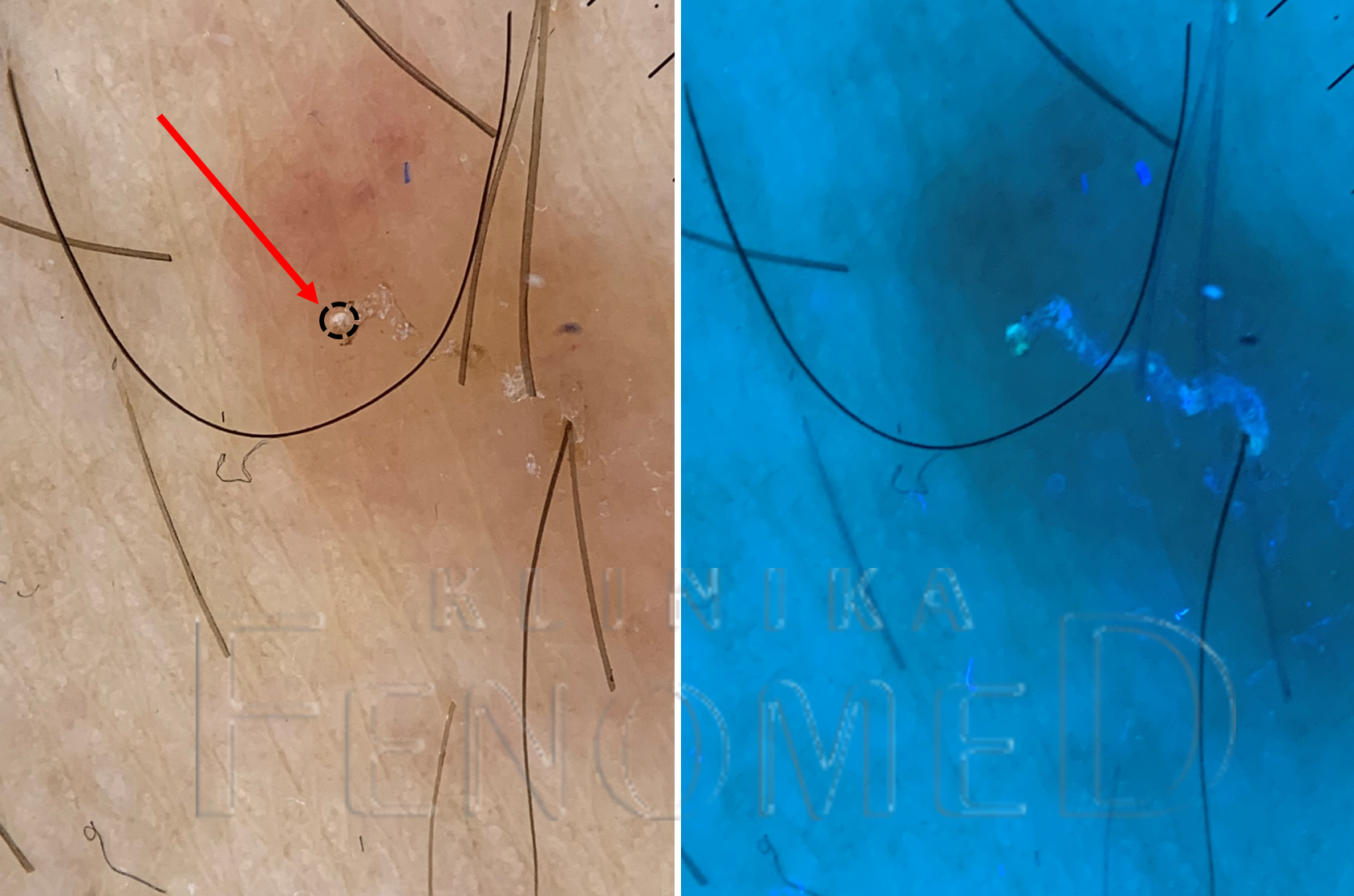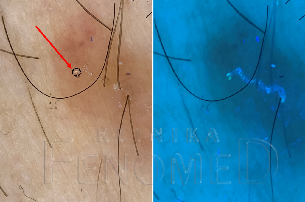 Świerzb zlokalizowany w obrębie skóry brzucha. Obraz uzyskany w badaniu dermatoskopowym oraz w świetle UV. Na fotografii widoczna jest charakterystyczna nora świerzbowcowa, a także osobnik Sarcoptes scabiei (świerzbowiec ludzki) zaznaczony strzałką.