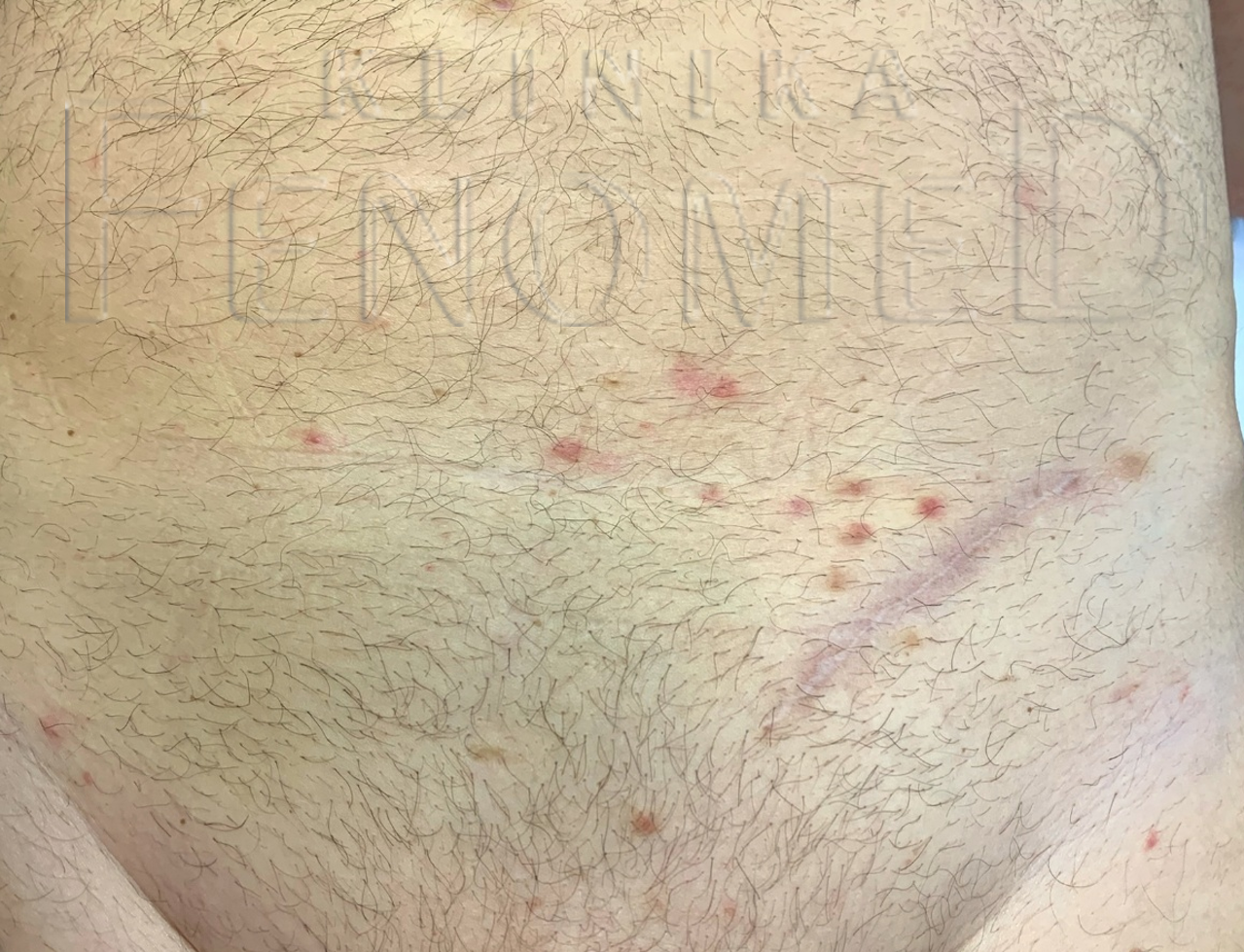 Świerzb zlokalizowany w obrębie skóry brzucha.