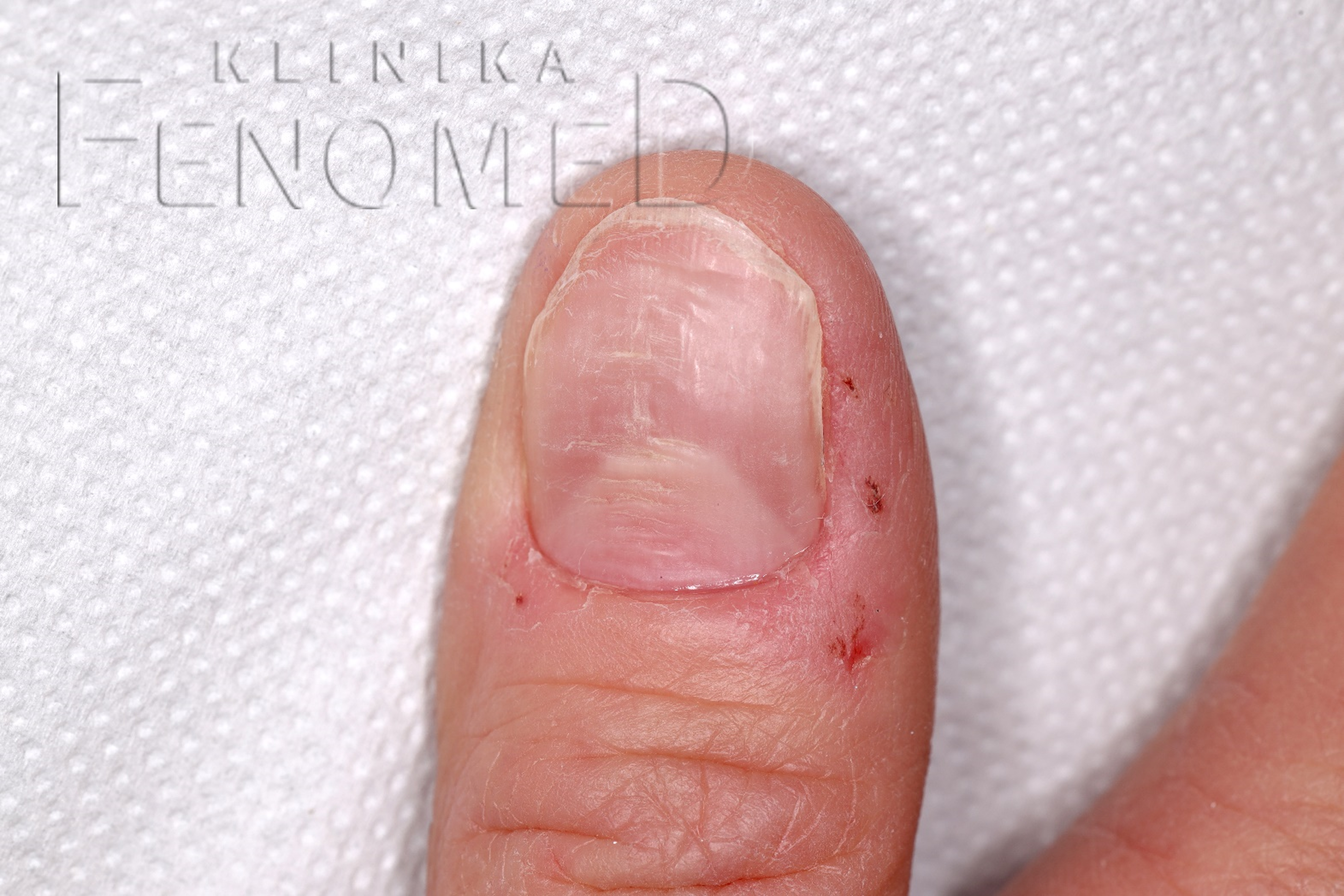 Uszkodzenie macierzy paznokcia doprowadziło do: – Pofałdowania płytki paznokcia – Występowania poziomych rowków Uszkodzenie nastąpiło w wyniku źle przeprowadzonego manicure.
