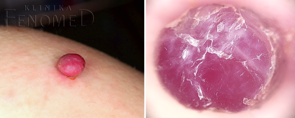 Ziarniniak naczyniowy zlokalizowany na skórze grzbietu u ciężarnej pacjentki. Zdjęcie kliniczne oraz z videodermatoskopu.