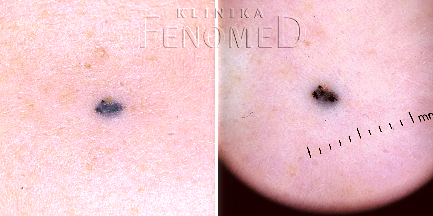 Znamię błękitne na skórze policzka oraz zdjęcie z dermatoskopu