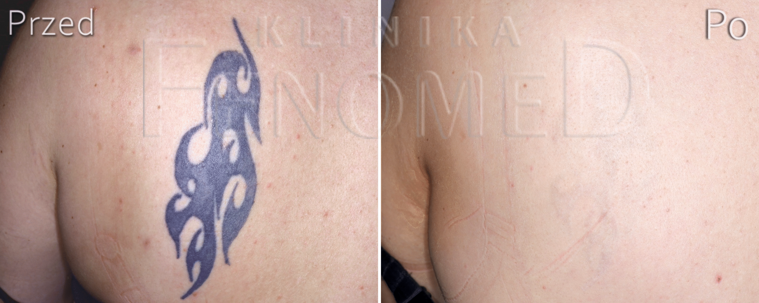 Usuwanie tatuażu zlokalizowanego na skórze pleców – stan przed i po 6 zabiegach laserowych